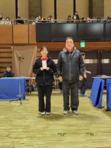 また今年度全日本選手権マスターズの部女子サーティで準優勝された片上知代選手(フォーネット)にお祝いをお渡ししました。
