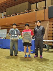 1/12(月)松山市総合コミュニティセンター(メインアリーナ)で4回目となるニッタクオレンジカップを開催しました。たくさんの商品を提供いただき、今年も日本卓球株式会社愛媛県担当営業の松谷さんが目玉商品の抽選を行って当選したペアにお渡しいただきました。